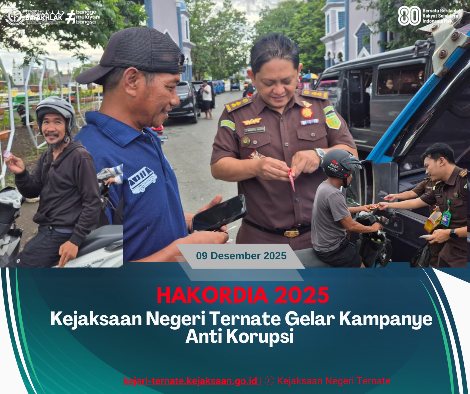 Kejari Ternate – (09/12/2025) Hari Selasa, 09 Desember 2025 pukul 15.00 WIT, berlokasi di sekitar Taman Nukila, Lapangan Salero, Jalan. Zaenal Abidin Syah (Depan Rumah Dinas dan Mess Kejaksaan Negeri Ternate), ASN Kejaksaan Negeri Ternate telah melaksanakan Kegiatan Kampanye Anti Korupsi dalam rangka memperingati Hari Anti Korupsi Sedunia (HAKORDIA) Tahun 2025;