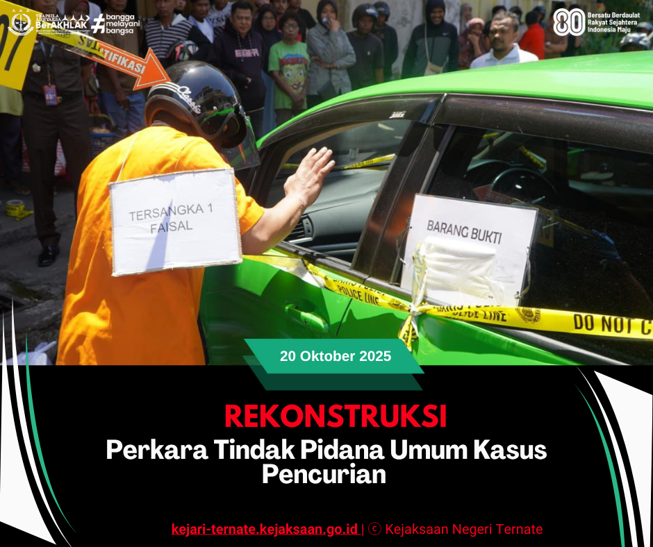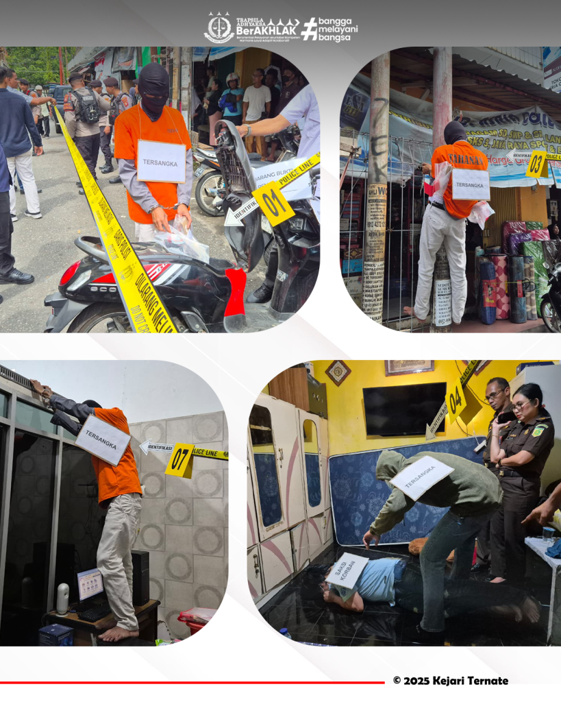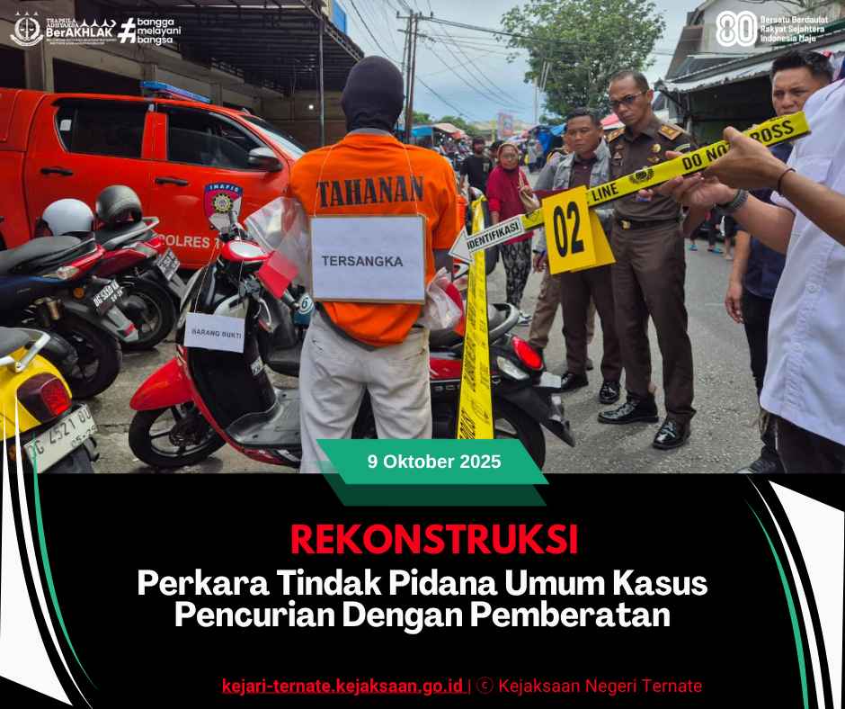 Kejari_Ternate (09/10/2025) Senin, 20 Oktober 2025 sekitar pukul 11.00 WIT, bertempat di Kelurahan Gamalama, Kecamatan Ternate Tengah, Kota Ternate, Kepolisian Resor (Polres) Ternate melaksanakan kegiatan rekonstruksi perkara tindak pidana pencurian yang melibatkan tiga orang tersangka;