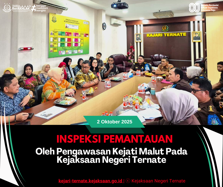 Bahwa Inspeksi Pemantauan Kejaksaan Tinggi Maluku Utara pada Kejaksaan Negeri Ternate berlangsung aman, tertib, dan kondusif serta selesai sekitar Pukul 13.00 WIT.