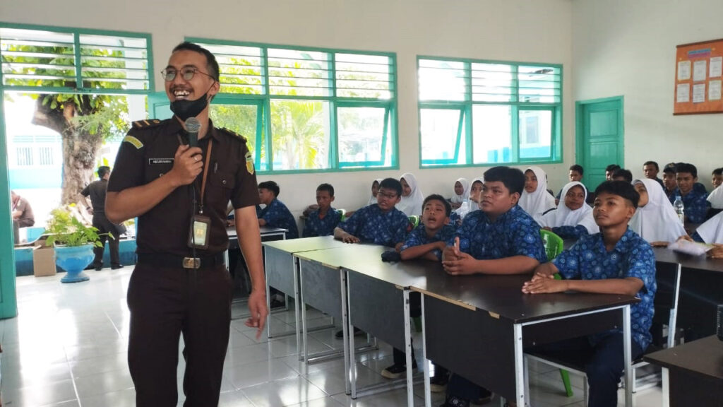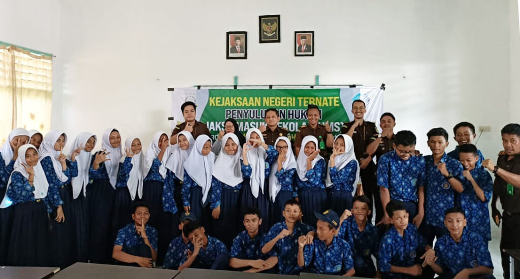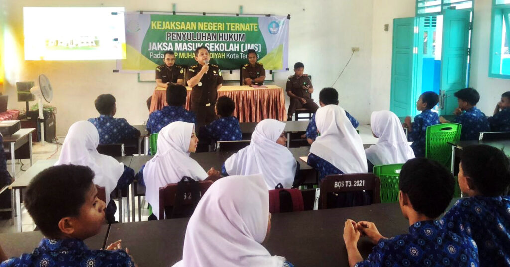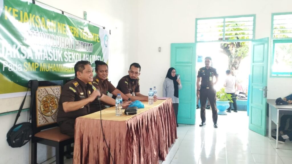 Kejari Ternate – (08/03/2023) Pukul 10.00 WIT bertempat di SMP Muhammadiyah 1 Kota Ternate, Kel. Bastiong Karance, Ternate Selatan, Kota Ternate, telah dilaksanakan kegiatan Penyuluhan Hukum melalui program Jaksa Masuk Sekolah, yang dipimpin oleh Bapak Aan Syaeful Anwar S.H., M.H. (Kasi Intelijen Kejari Ternate), bersama dengan 5 staf intelijen. Adapun materi yang diangkat “ Penanaman Nilai-Nilai Anti Korupsi Dan Kenakalan Remaja “.