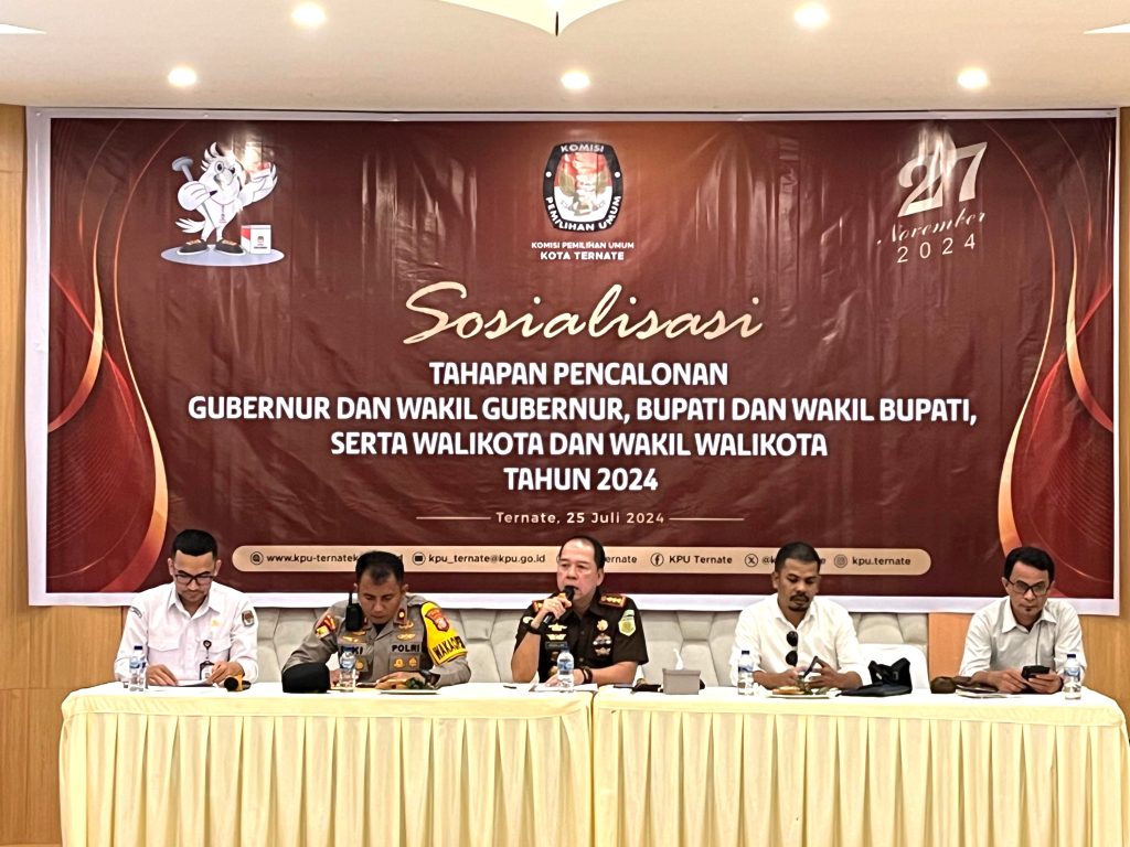 Kejari_Ternate (25/07/2024) Pada hari Kamis Tanggal 25 Juli 2024 Pukul 09.30 WIT bertempat di Kalumata Room, Waterboom Ternate Kec. Ternate Sel., Kota Ternate, Maluku Utara telah dilaksanakan Sosialisasi Tahapan Pencalonan Gubernur dan Wakil Gubernur, Bupati dan Wakil Bupati, Serta Walikota dan Wakil Walikota Tahun 2024