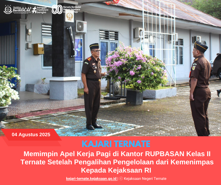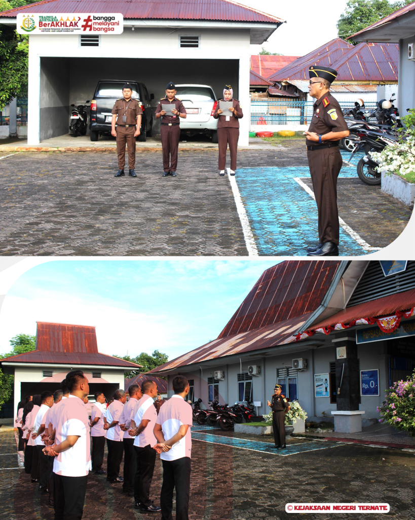 Kejari_Ternate (04/08/2025) Senin, tanggal 04 Agustus 2025 sekitar Pukul 07.30 WIT, bertempat di halaman kantor Rumah Penyimpanan Benda Sitaan Negara (RUPBASAN) Kelas II Ternate yang beralamat di Jl. Pengayoman No.2, Jambula, Kec. Pulau Ternate, Kota Ternate, Maluku Utara, telah dilaksanakan Apel Pagi yang dipmpin oleh Kepala Kejaksaan Negeri Ternate Bapak Syamsidar Monoarfa, S.H, M.H.