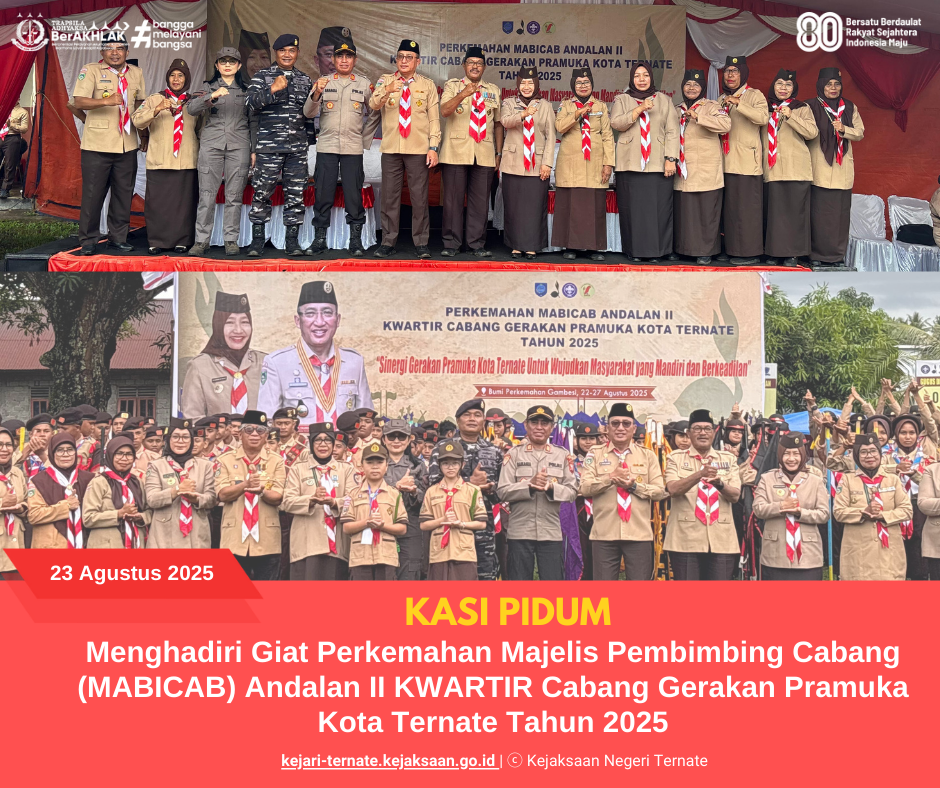 Kejari_Ternate – (26/08/2025) Pada hari Sabtu, tanggal 23 Agustus 2025 sekitar Pukul 06.30 WIT, berlokasi di Bumi Perkemahan Gambesi, Ibu Joice Amelia Ussu, S.H., M.H. (kasi Pidum Kejari Ternate) menghadiri kegiatan Perkemahan Majelis Pembimbing Cabang (MABICAB) Andalan II KWARTIR Cabang Gerakan Pramuka Kota Ternate Tahun 2025;