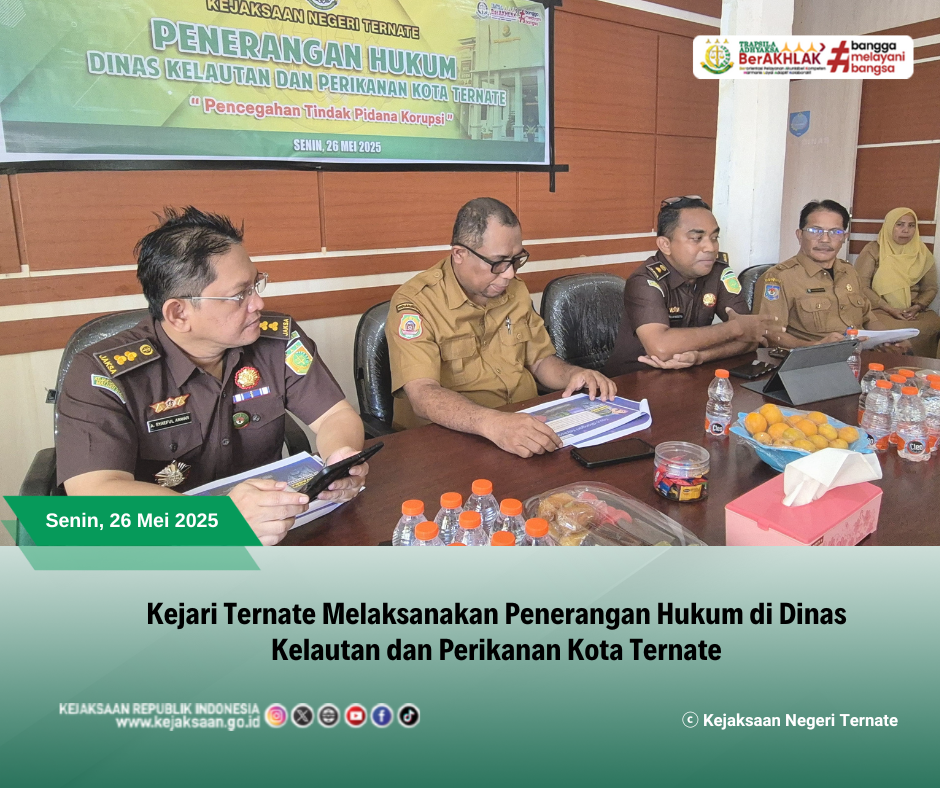 Kejari_Ternate (26/05/2025) Senin, pukul 09:00 WIT, bertempat di Kantor Dinas Kelautan Dan Perikanan Kota Ternate, Jl. Kepiting, Kel. Dufa Dufa, Kec. Kota Ternate Utara, Kota Ternate, Maluku Utara. Tim Penerangan Hukum (Penkum) Kejaksaan Negeri Ternate yang dipimpin oleh Bapak Aan Syaeful Anwar, S.H., M.H (Kepala Seksi Intelijen) bersama Bapak Meliyan Marantika, S.H. (Kepala Sub Bagian Pembinaan) melaksanakan kegiatan Penerangan Hukum (Penkum) melalui program pembinaan masyarakat taat hukum (BINMATKUM), dengan mengusung tema “Pencegahan Tindak Pidana Korupsi”;