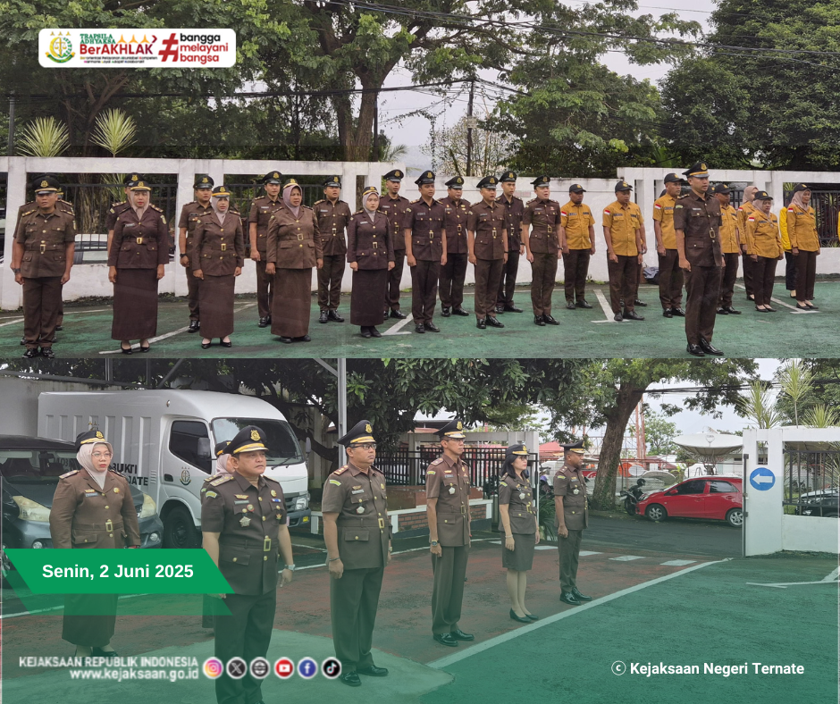 Kejari_Ternate (02/06/2024) Senin, Pukul 07:30 WIT, bertempat di halaman Kantor Kejaksaan Negeri Ternate, Jl. SKSD Palapa Tanah Mesjid, Kalumpang, Ternate Tengah, telah dilaksanakan Upacara dalam rangka Peringatan Hari Lahir Pancasila dengan menggunakan Pakaian Dinas Upacara Kecil (PDUK). Adapun tema yang diangkat “Memperkokoh Ideologi Pancasila Menuju Indonesia Raya”. Bertindak sebagai Inspektur Upacara adalah Plt. Kepala Kejaksaan Negeri Ternate Bapak Dedyng Wibiyanto Atabay, S.H., M.H. yang diikuti oleh Kasubagbin, Para Kasi, Jaksa Fungsional, Pegawai Kejari Ternate dan Pegawai Pemerintah Non Pegawai Negeri Sipil (PPNPNS) pada Kejaksaan Negeri Ternate mengikuti Upacara Peringatan Hari Lahir Pancasila Tahun 2025.