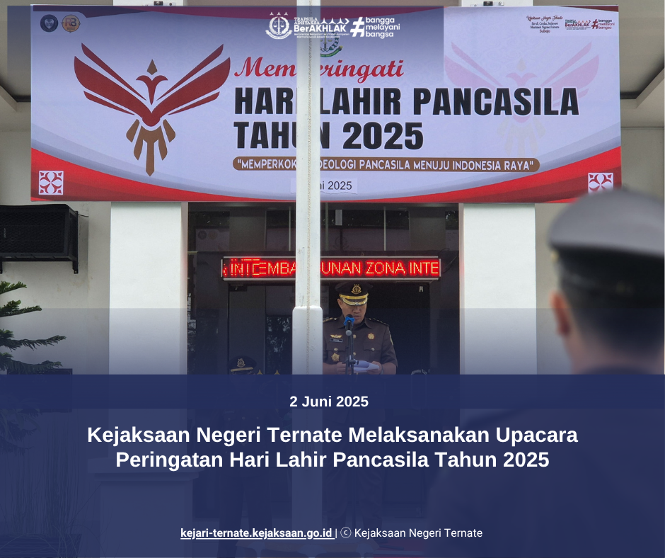 Plt. Kepala Kejaksaan Negeri Ternate Bapak Dedyng Wibiyanto Atabay, S.H., M.H. selaku Inspektur Upacara membacakan sambutan Kepala Badan Pembinaan Ideologi Pancasila Republik Indonesia menyampaikan bahwa Pancasila bukan sekadar dokumen historis atau teks normatif yang tertulis dalam pembukaan UUD 1945. Ia adalah jiwa bangsa, pedoman hidup bersama, serta bintang penuntun dalam mewujudkan cita-cita Indonesia yang merdeka, bersatu, berdaulat, adil dan makmur.