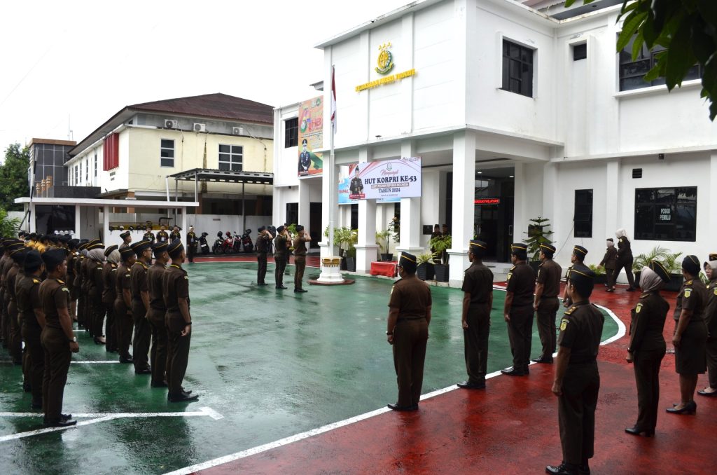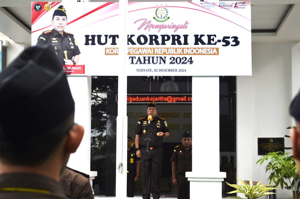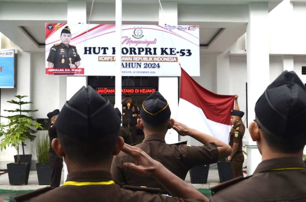 Kejari_Ternate (02/12/2024) Senin, Pukul 07:30 WIT, bertempat di halaman Kantor Kejaksaan Negeri Ternate, Jl. SKSD Palapa Tanah Mesjid, Kalumpang, Ternate Tengah, telah dilaksanakan Upacara dalam rangka Peringatan Hari Ulang Tahun ke-53 KORPS Pegawai Republik Indonesia Tahun 2024 dengan menggunakan Pakaian Dinas Harian (PDH). Bertindak sebagai Inspektur Upacara adalah Kepala Kejaksaan Negeri Ternate Bapak Abdullah, S.H., M.Hum. yang diikuti oleh Plh. Kasubagbin, Para Kasi, Jaksa Fungsional, Pegawai Kejari Ternate dan Pegawai Pemerintah Non Pegawai Negeri Sipil (PPNPNS) pada Kejaksaan Negeri Ternate.