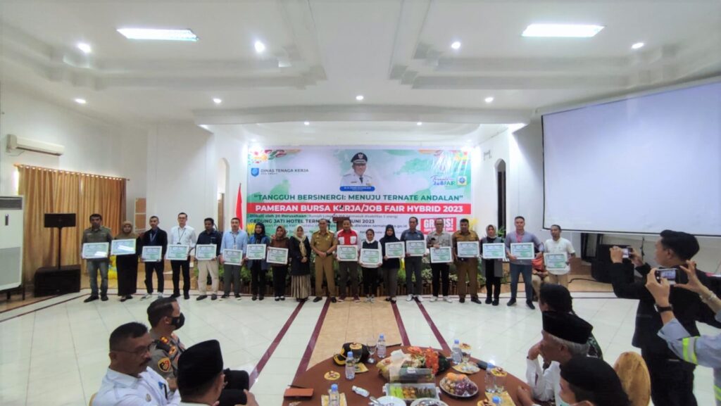 Kejari-Ternate (26/06/2023) Senin, Pukul 09:00 WIT, bertempat di Hotel Jati, Kelurahan Jati, Ternate Selatan, telah berlangsung Job Fair Hybrid Kota Ternate Tahun 2023 yang diselenggarakan oleh Dinas Ketenagakerjaan Kota Ternate, dengan tema “Tangguh Bersinergi: Menuju Ternate Andalan”. Kasi Intelijen Bapak Aan Syaeful Anwar, SH, MH. mewakili Kajari Ternate turut hadir dalam kegiatan tersebut. Acara diselenggarakan secara Hybrid luring dan daring dan melibatkan 20 perusahaan dengan jumlah lowongan pekerjaan sebanyak 25.768 (termasuk lowongan disabilitas sejumlah 5 orang). Pendaftaran Pencari Kerja dapat dilakukan melalui link https://lentera-disnaker.ternatekota.go.id