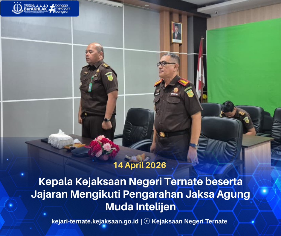 Kejari Ternate – (14/04/2026) Selasa tanggal 14 April 2026 pukul 11:00 WIT, bertempat di Aula Baharuddin Lopa, Lt. 3 Kantor Kejaksaan Negeri Ternate, telah dilaksanakan kegiatan Zoom meeting Pengarahan Jaksa Agung Muda Intelijen (JAMINTEL) Bapak Prof. Dr. Reda Manthovani, S.H., L.LM terkait Pengamanan Sumber Daya Organisasi (PAM SDO) dan Pengamanan Penanganan Perkara (PAM PP) Dalam Rangka Menjaga Marwah Institusi Kejaksaan;