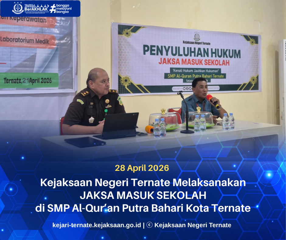 Kejari_Ternate (28/04/2026) Selasa, 28 April 2026, Pukul 10.00 WIT bertempat di SMP Al Qur’an Putra Bahari Kota Ternate , Kel. Mangga Dua, Ternate Selatan, Kota Ternate, telah dilaksanakan kegiatan Penyuluhan Hukum melalui program Jaksa Masuk Sekolah, yang dibawakan oleh Bapak Andi Hamzah Kusumaatmaja, S.H., M.H., Selaku Seksi Intelijen. Adapun tema yang diangkat Penanaman Nilai-Nilai Anti Korupsi Dan Kenakalan Remaja;