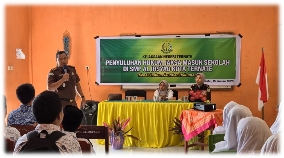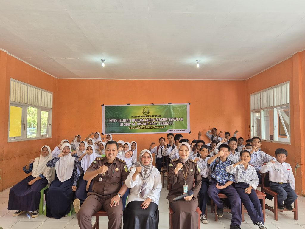 Kejari_Ternate (15/01/2025) Pada Hari Rabu Pukul 10.00 WIT, bertempat di SMP AL-IRSYAD Kota Ternate, Jl. Jati Baru, Jati Perumnas, Kec. Ternate Selatan, Kota Ternate telah dilaksanakan kegiatan Penyuluhan Hukum melalui program Jaksa Masuk Sekolah, yang dipimpin oleh Kepala Sub Seksi Intelijen, Ainur Rofiq S.H., bersama dengan jajarannya. Jaksa Masuk Sekolah (JMS) di SMP AL-IRSYAD Kota Ternate mengangkat tema “Tawuran, Narkoba, Seks Bebas” dan pembagian Merchandise pada Jaksa Masuk Sekolah (JMS) Tahun 2025.