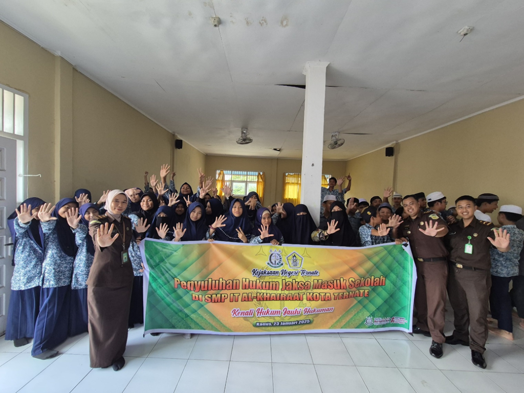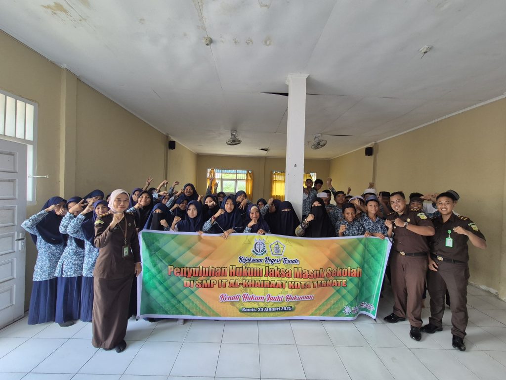 Kejari_Ternate (23/01/2025) Pada Hari Kamis Pukul 12.00 WIT, bertempat di SMP IT AL-KHAIRAAT Kota Ternate, Kel. Takoma, Kec. Ternate Tengah, Kota Ternate, Maluku Utara, telah dilaksanakan kegiatan Penyuluhan Hukum melalui program Jaksa Masuk Sekolah, yang dibawakan oleh Bapak Ainur Rofiq S.H., Kasubsi I Seksi Intelijen Kejaksaan Negeri Ternate sebagai narasumber;