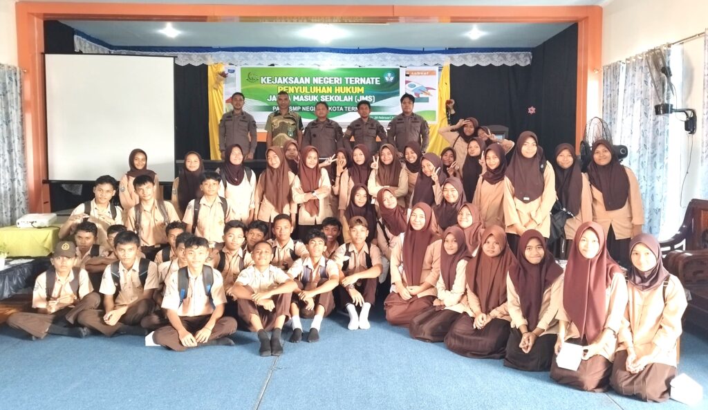 Kejari_Ternate (29/02/2024) Pukul 10.00 WIT, bertempat di SMP Negeri 2 Kota Ternate, Jl. Batu Angus, Kel. Dufa Dufa, Kec. Kota Ternate Utara, Kota Ternate, telah dilaksanakan kegiatan Penyuluhan Hukum melalui program Jaksa Masuk Sekolah, yang dipimpin oleh Kepala Seksi Intelijen, Aan Syaeful Anwar S.H., M.H., bersama dengan jajarannya. Jaksa Masuk Sekolah (JMS) di SMP Negeri 2 Kota Ternate mengangkat tema “Pengenalan Tugas dan Fungsi Kejaksaan” serta “Penanaman Nilai-Nilai Anti Korupsi Dan Kenakalan Remaja“.