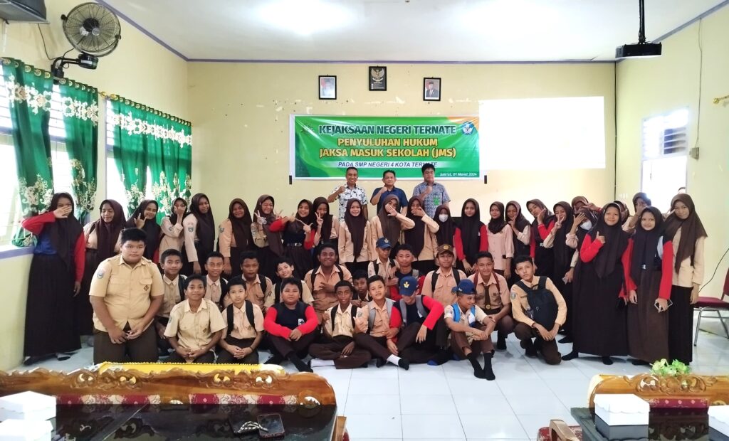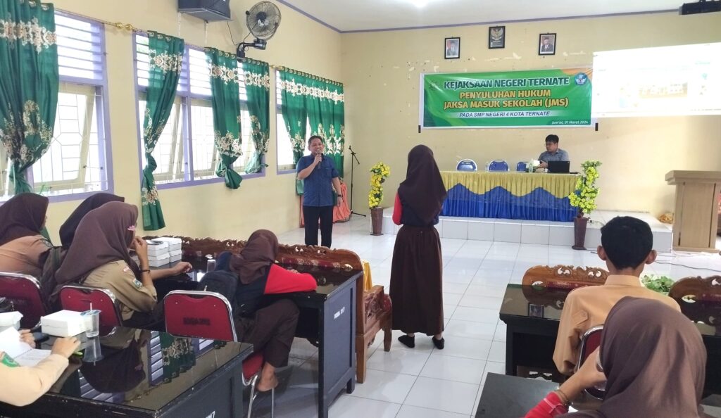 Kejari_Ternate (01/03/2024) Pukul 10.00 WIT, bertempat di SMP Negeri 4 Kota Ternate, Kelurahan Bastiong Talangame, Ternate Selatan, Kota Ternate, telah dilaksanakan kegiatan Penyuluhan Hukum melalui program Jaksa Masuk Sekolah, yang dipimpin oleh Kepala Seksi Intelijen, Aan Syaeful Anwar S.H., M.H., bersama dengan jajarannya. Jaksa Masuk Sekolah (JMS) di SMP Negeri 4 Kota Ternate mengangkat tema “Pengenalan Tugas dan Fungsi Kejaksaan” serta “Penanaman Nilai-Nilai Anti Korupsi Dan Kenakalan Remaja“.