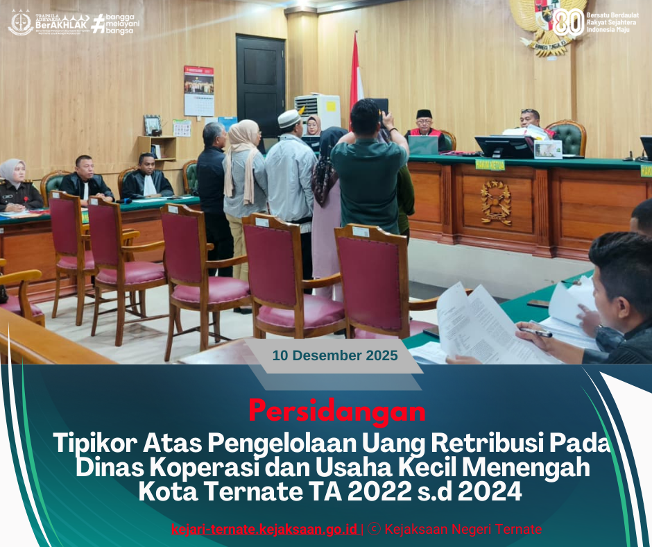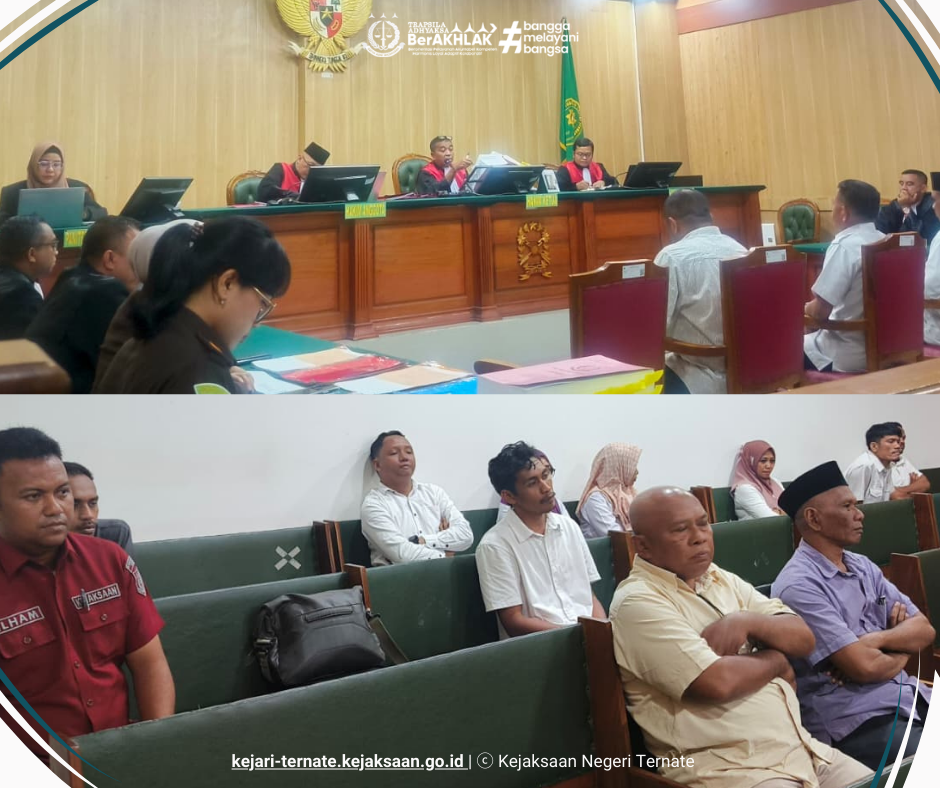Kejari_Ternate – (10/12/2025) Rabu, 10 Desember 2025 sekitar pukul 11.00 WIT, bertempat di Ruang Sidang Prof. Dr. Muhammad Hatta Ali pada Pengadilan Negeri Ternate Kelas 1A, dilaksanakan sidang Tindak Pidana Korupsi An. Lutfi Umahuk, Jamaludin Yusup dan Hadi Hairuddin dengan agenda Pemeriksaan Saksi;