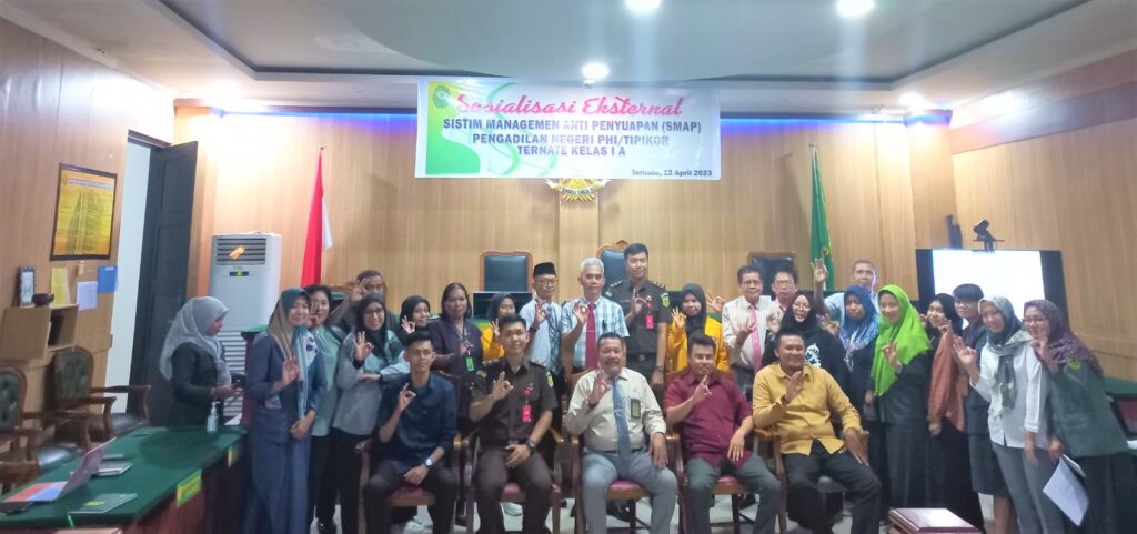 Kejari Ternate – (12/04/2023) Rabu, tanggal 12 April 2023 Pukul 09.10 WIT bertempat di Ruang Sidang Utama Prof. Dr. Muhammad Hatta Ali, S.H., M.H. pada Pengadilan Negeri Ternate, telah dilaksanakan Sosialisasi Eksternal Sistem Managemen Anti Penyuapan (SMAP). Sosialisasi tersebut bertujuan untuk memberikan kepastian kepada organisasi bahwa sistem anti penyuapan yang diterapkan telah mencakup prosedur yang memadai terhadap penyuapan dan korupsi. Adapun turut hadir dalam sosialisai tersebut dari unsur Kejaksaan, Polres, Hakim, Panitera, dan Mahasiswa. Acara berlangsung tertib, aman serta selesai pada Pukul 10.00 WIT.