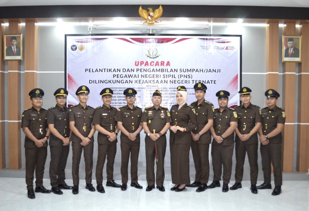 Kejari Ternate – (31/05/2023) Rabu, Pukul 08:30 WIT hingga selesai, bertempat di Aula Baharuddin Lopa (Lantai 3) Kantor Kejaksaan Negeri Ternate, telah dilaksanakan Upacara Pelantikan Dan Pengambilan Sumpah/Janji Pegawai Negeri Sipil (PNS) Di Lingkungan Kejaksaan Negeri Ternate yang diikuti 10 Calon Pegawai Negeri Sipil. Upacara di pimpin langsung oleh Kepala Kejaksaan Negeri Ternate, Bapak Abdullah, S.H., M.Hum dan dihadiri oleh Kasubag, Para Kasi dan seluruf staf di lingkungan Kejaksaan Negeri Ternate.