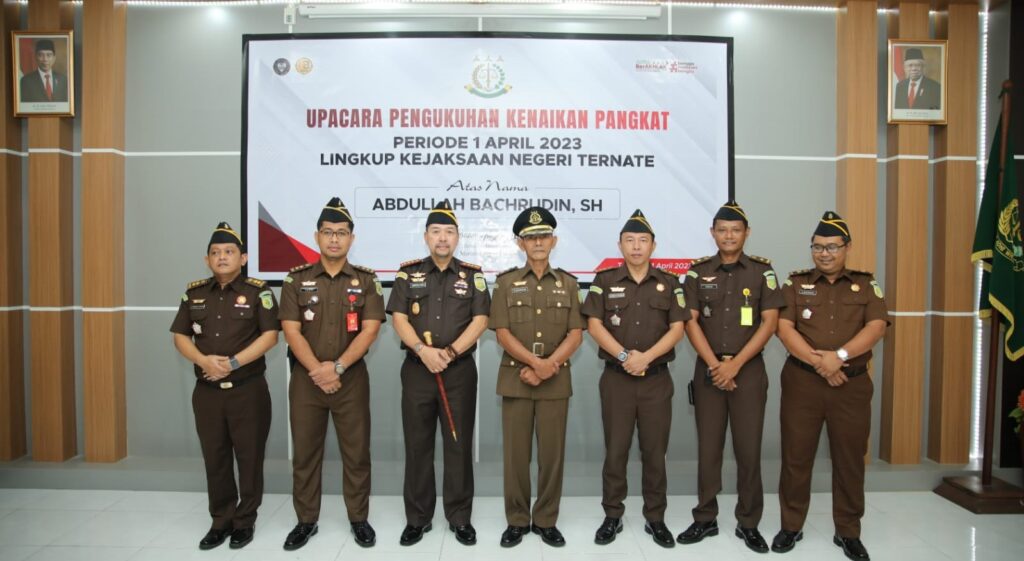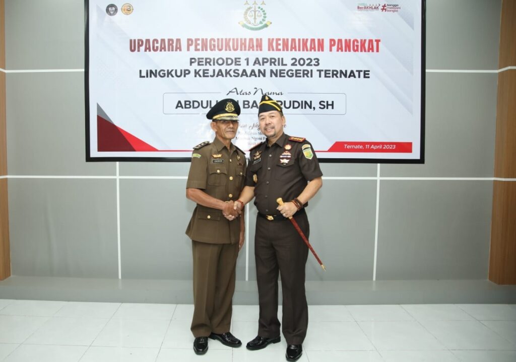 Setelah itu, acara dilanjutkan dengan pemasangan tanda pangkat baru kepada pejabat yang menerima kenaikan pangkat. Pejabat tersebut adalah Abdullah Bachruddin, SH yang sebelumnya menyandang pangkat Jaksa Muda (III/D) pangkat baru naik menjadi Jaksa Madya (IV/A). Akhir acara kegiatan dilakukan foto bersama dengan semua pegawai Kejaksaan Negeri Ternate.